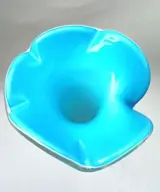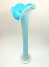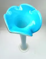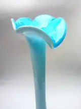 Hoge paarse houder met ronde voet en bloemvormig glas van lichtblauw opaline glas en helder glasoppervlak, ook op de voet.