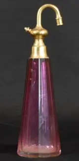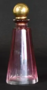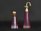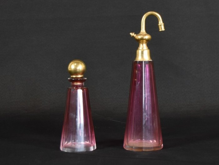 Zeer oude toiletset bestaande uit 2 Italiaans kristallen parfumflesjes in rood geslepen. Afm: 23 en 15cm