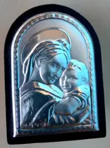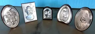 Lot van 5 verzilverde ovalen op houten sokkel. In goede staat, met kleine ouderdomssporen zoals zichtbaar op de foto's.