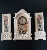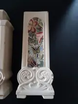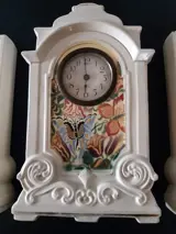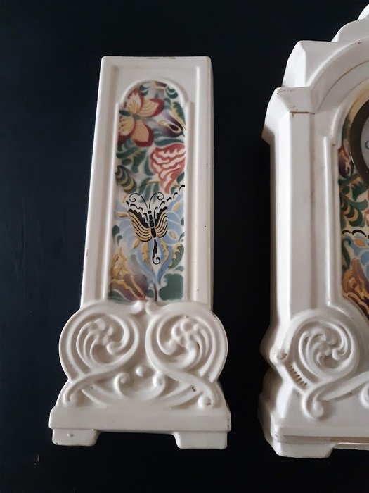 Art Nouveau pendule van keramiek. Het heeft een prachtig motief van vlinders en bloemen en is handgeschilderd. Het opwind mechanisme van de klok loopt niet naar behoren. Op het keramiek zijn een aantal geringe chips aanwezig die makkelijk zijn te herstellen.