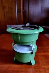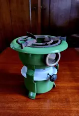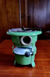 Dit leuke petroleum brandertje ziet er nog erg goed uit. Zijn mooie jaren 50 kleur heeft hij dan ook goed behouden. Hij word geleverd zoals op de foto dus met lont.