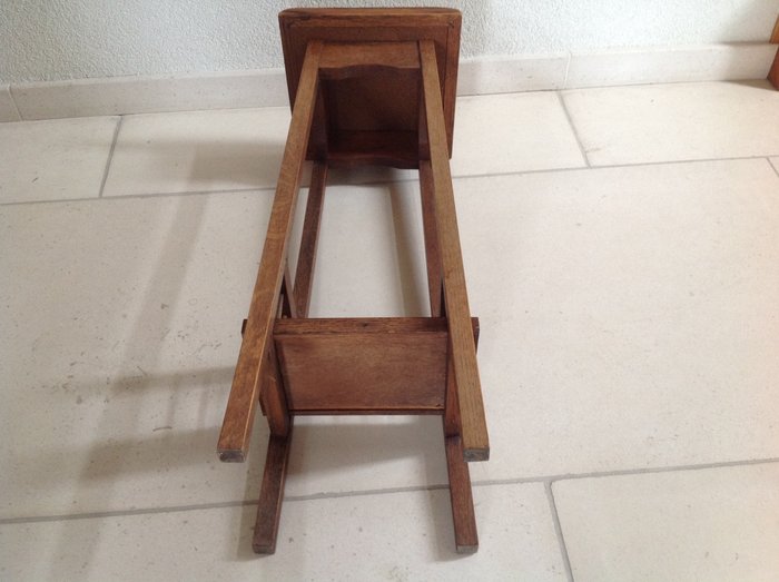 Mooi eikenhouten bijzettafeltje, plantentafeltje met een ingelegde porseleinen tegel , voorstelling een antieke zeilboot . Plant hoort niet bij de verkoop .