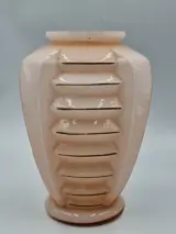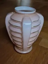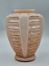 Fraaie Art Deco vaas in een (baby) roze kleur met goudkleurige accenten. Deze lijnen vertonen lichte sleetsheid op sommige plekjes.