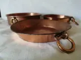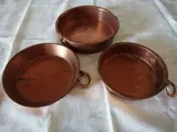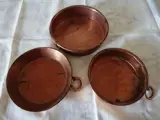Set gevormd door drie vintage rood koperen potten/pannen, de potten hebben haken om ter decoratie aan de muur te hangen en zijn in goede staat.
