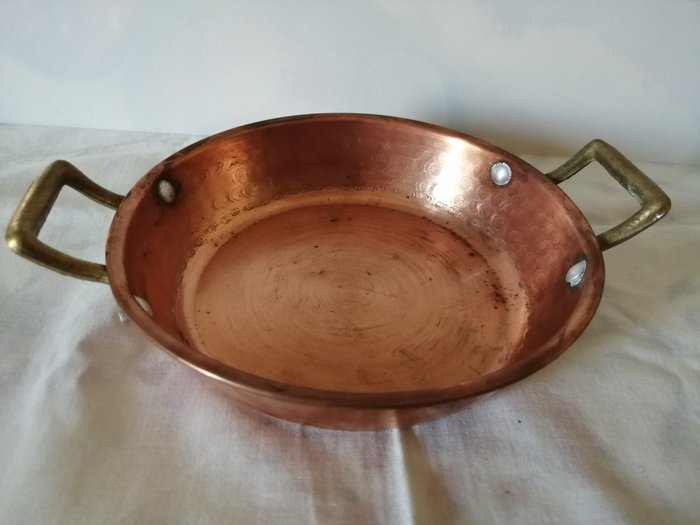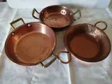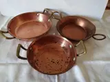 Set bestaande uit drie roodkoperen potten/pannen, de potten hebben handvatten en zijn geschikt voor zowel de keuken als voor de inrichting en verkeren in goede staat.