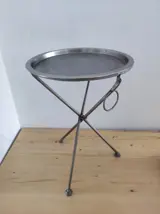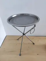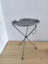 Luxe inklapbare bijzettafel van geborsteld antique nickel kleurig metaal (vintage finish). Het tafelblad van de tafel is afneembaar en kan ook als dienblad wordten gebruikt. Veelzijdig inzetbaar, bijv. als bijzettafel, nachttafel, haltafel, salontafel, enz. Het karakteristieke ontwerp wordt gekenmerkt door de gekruiste 3-poot en de metalen ring
