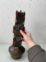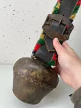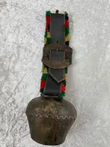 Grote Oude Koeienbel aan Lederen band met gekleurd wol uit Zwitserland, jaren ‘60.