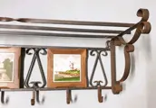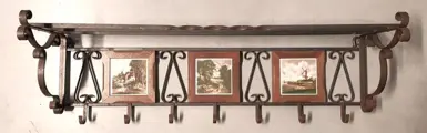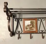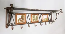 Prachtige vintage smeedijzeren wandkapstok. Deze kapstok is versierd met tegeltjes en beschikt over 7 haken en een hoedenrekje voor uw spulletjes.