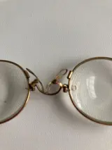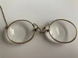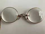 antiek neus brilletje met veiligheidsketting en oorschelp in goudachtige kleur of goud ? Fijne brug en vergrootglazen. Het brillendoosje is in gevlamd gelakt metaal bedekt met fluwelen stof. In beide kanten zijn moeilijk zichtbare stempel svan de firma Priest & Ashmore Sheffied te zien.
