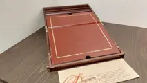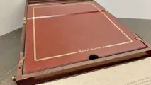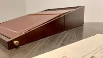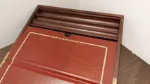 Met een lederen schrijfbaar, met daaronder een tweetal opbergvakken voor papieren, een aflegmogelijkheid op een drietal richels voor uw kroontjespennen of vulpen of overige schrijfwaren. Verder wordt een document ingesloten over het ontstaan van deze schrijfkist.