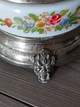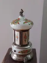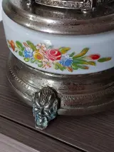 Muziekdoos Sigarettenkoker, sigarenkoker, lippenstifthouder van het bekende Zwitserse merk "REUGE", vervaardigd omstreeks 1955/60. Muziekdoos van metaal en glas, voornamelijk wit, met diverse bloemenschilderingen in diverse kleuren.