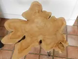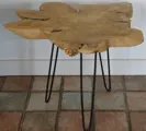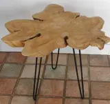 Een prachtig gevormd blad van warm Suar hout op zwart metalen haarspeldpoten.Het blad is ca. 67 x 60 cm en de hoogte is 50 cm.Kan gebruikt worden als salontafel of bijzettafel.