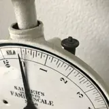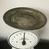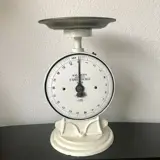 Keukenweegschaal, wit versterkt, met messing wijzerplaat.