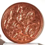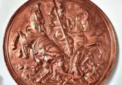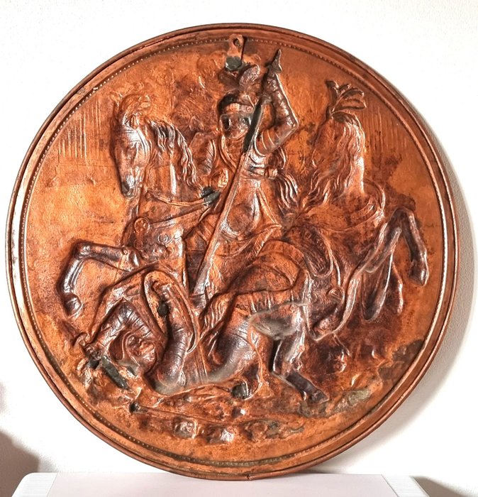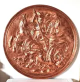 Groot roodkoperen schild/plaat met Ridder scènes.