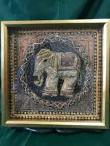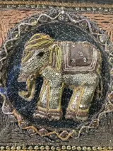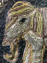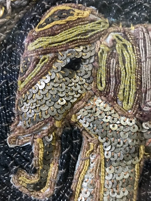 Prachtige Birmese handgemaakte tapijt Kalaga ~ Geborduurd reliëf olifant met de hand gestikt met ingewikkelde gouden draden en versierd met pailletten, kralen, glazen stenen