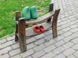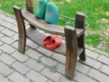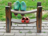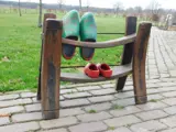 Nostalgie ten top! Een oud Hollands klompenrek van begin deze eeuw nu ook te gebruiken als schoenenrek. Het is van hardhout en smeedijzer gemaakt en ca. 51 x 66 x 25 cm.