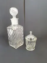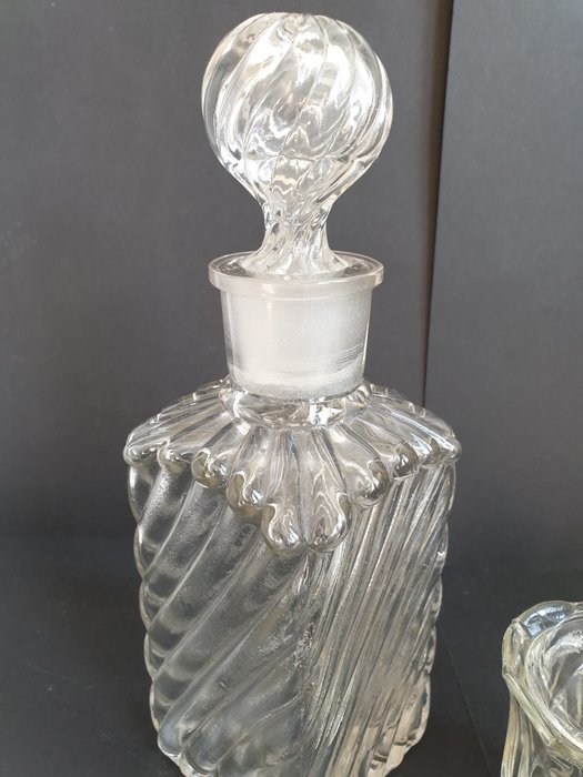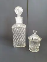 Karaf en mosterd, vooroorlogse geperste school, kleine karaf voor likeur of tinctuur in zeer goede staat zonder beschadigingen, mosterdpotje - in zeer goede staat, zonder lepel