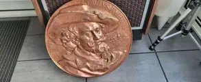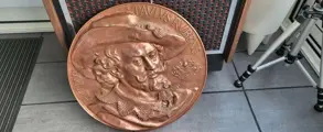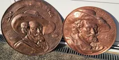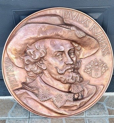 Paar zeer grote koperen schalen in reliëf die Petrus Paulus Rubens voorstellen, de kleinste heeft een diameter van 61 cm, de tweede heeft een diameter van 70 cm. Ze zijn in uitstekende staat, geen ongelukken of deuken. Ze zijn aan de achterkant voorzien van een haaklipje. Gewicht van de twee samen bijna 4 kg.