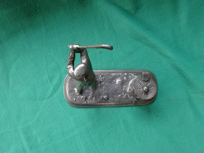 Tinnen sculptuur van golfer bij put. Tevens Inktpot.