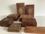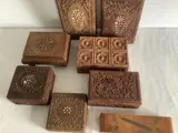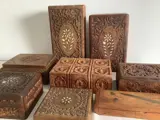 Mooie houten dozen ,voor sieraden en sigaren. Handgesneden. Een stukje vakmanschap. Vier ingelegd met been en 1 ingelegd met messing. De grootste meet 22,5 cm x 12,5 cm x 6,5 cm de kleinste 11 cm x 11 cm x 3,5 cm. De foto’s geven een goed beeld van de kavel en alles wordt met veel zorg verpakt en verzonden met track en trace code.