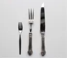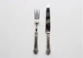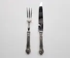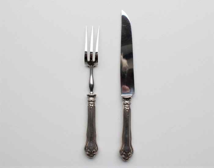 Een zilveren serveerset met een grote vork en vleesmes. De handgrepen zijn versierd met een klassiek decor van acanthusbladeren. De vork en mes zijn gedeeltelijk van roestvrij staal gemaakt.
