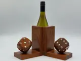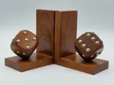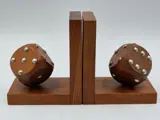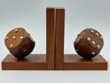 Strak vormgegeven massief houten boekensteunen met dobbelstenen. De benummering is van metaal. Goede solide en degelijke kwaliteit. Ze verkeren in een prachtige onbeschadigde staat. Zie hiervoor de foto's