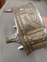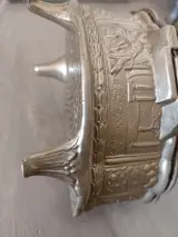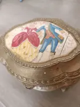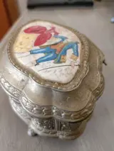 Juwelenkistje in antimoon, reliëfwerk aan elke kant en een geglazuurde keramische plaat op het deksel aangebracht, voorstellende twee jonge mensen die elkaar omhelzen.