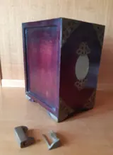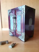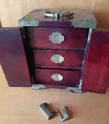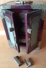 Zeldzame antieke kist/juwelenkist, met lades, hangslot en twee afsluitbare deuren. Volledig in hout met minutieus bewerkte messing inzetstukken.