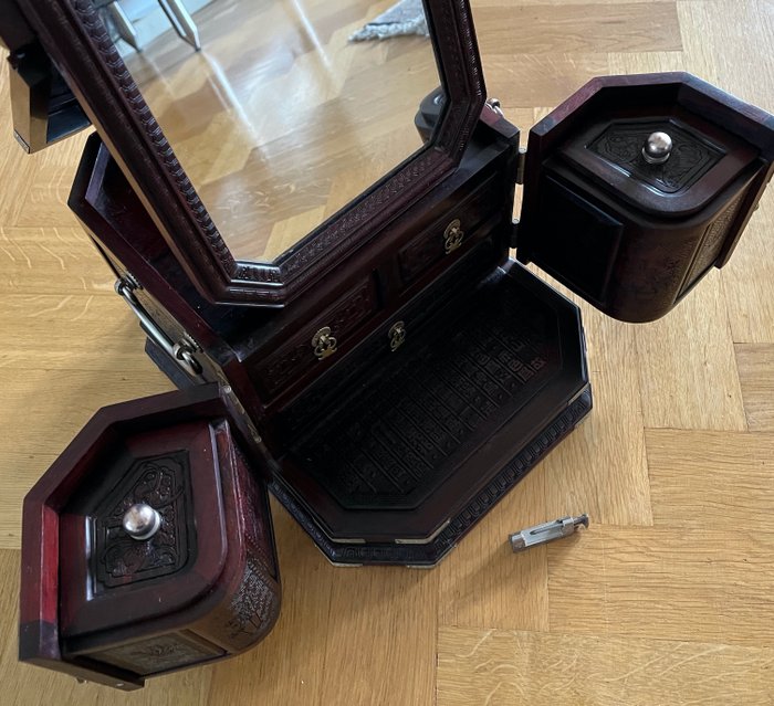 Fraaie palissander sieradenkist, met diverse laden, bakjes en opstaande spiegel.