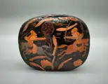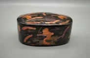 Handgemaakt, bedekt met gelakt papier-maché. Prachtig versierd tegen een zwarte achtergrond, toont de doos een verhaal van strijdende soldaten ter paard, een oorlogstafereel, fijn vervaardigd en geschilderd.