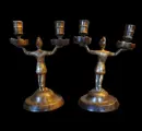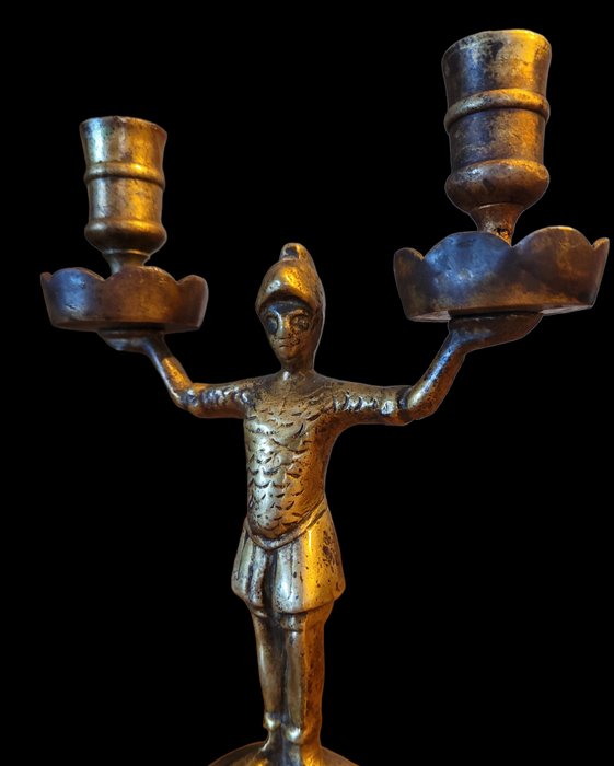 Fantastisch paar bijpassende tweearmige kandelaars in gegoten brons/messing in de vorm van soldaten met harnassen en helmen. Ze dragen geen maker's mark, maar dateren uit het begin van de 19 eeuw.?? Dit zijn echte verzamelstukken, die in elke setting zouden opvallen.