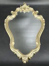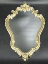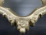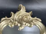 De spiegel heeft mooie florale versieringen gemaakt van een soort geperst hout.