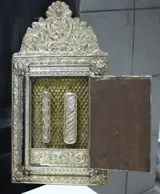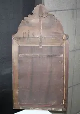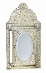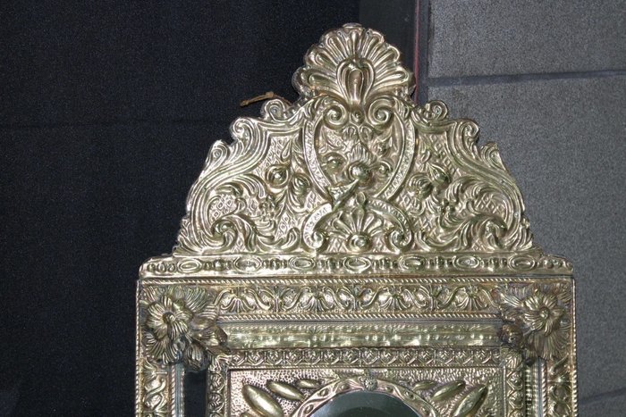 Antieke Hollandse stijl hout en messing gedecoreerde borstelkast. Floral wandkast, spiegelkast ook te gebruiken als sleutelkast, als gangkast. Gemaakt in Nederland rond 1920. Binnenin twee borstels die werden gebruikt om kleding schoon te maken. Deze prachtige kast heeft wat ouderdoms- en gebruikssporen, wat vlekjes op de gekantelde spiegels. Met hard werken is het messing gereinigd met professionele producten. Bijgevoegd zijn foto's van voor en na de restauratie. Foto's zijn een belangrijk onderdeel van de artikelbeschrijving.