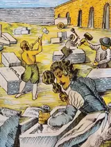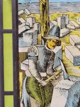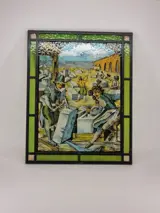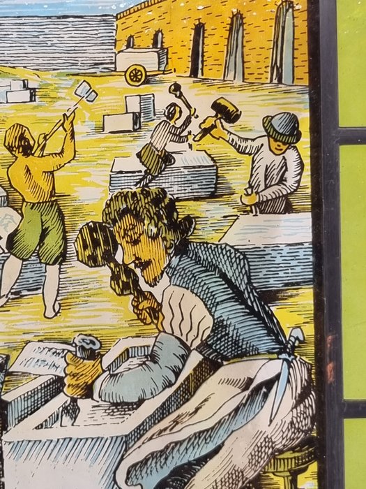 Het glasraam heeft als voorstelling, ambachtslieden.