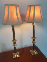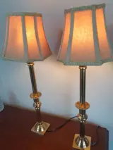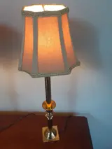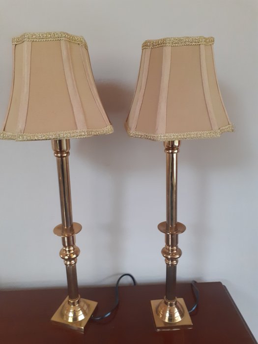 In prima staat stel koperen tafellampen met mooie klassieke zijde kapjes. Prachtige rustige licht doorstraling..