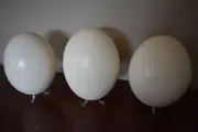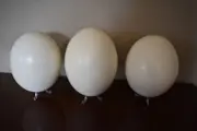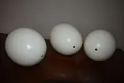 Struisvogeleieren met klein gaatje in waarlangs het ei werd geledigd en gereinigd. Elk struisvogelei is uniek, de maten kunnen dus iets verschillen.(zie foto's).