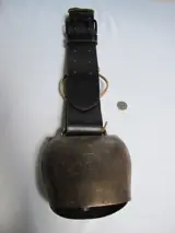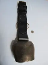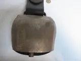 Een supergrote koebel met lederen riem. In zeer goede staat, volgens mij nooit gebruikt. Herkomst Oostenrijk. Periode eind vorige eeuw. Met zeer goed werkende klepel en geeft een fraai geluid. De bel zelf is 17 cm. hoog, 14 cm. breed en de opening van de bel is 8 cm. De lederen riem is dik tuigleer met metalen gesp. De riem zelf is 108 cm. lang en 7 cm. breed. Kleur zwart. Op de bel zelf is een afbeelding van een steenbok en nr. 5. Deze bel is een fraaie decoratie of om te gebruiken in een bedrijf. De bel wordt goed verpakt en traceerbaar verzonden. Afhalen is ook mogelijk.