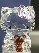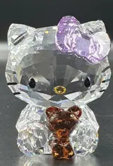 Hello Kitty draagt een kenmerkende paarse kristallen strik. In haar handen houdt ze haar favoriete teddybeer, gemaakt van bruin kristal.