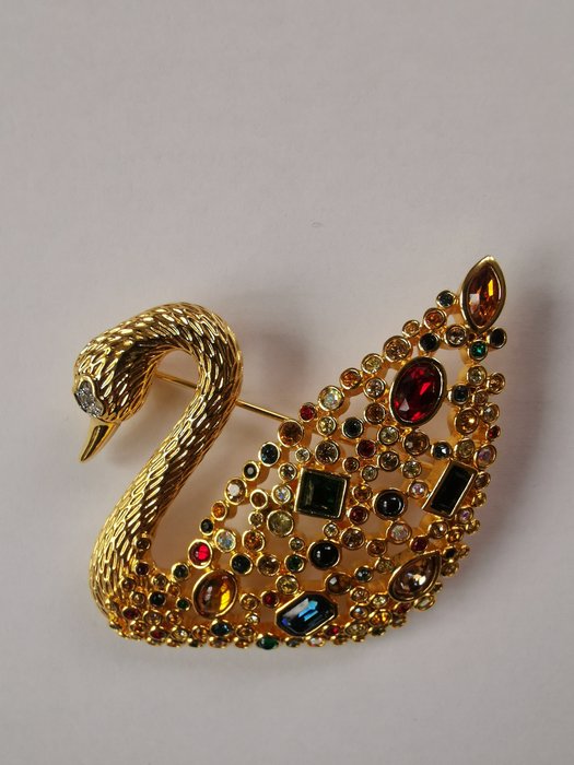 Grote vergulde vintage zwaanbroche van SWAROVSKI. Deze broche werd uitgebracht in 1995 voor het 100-jarig bestaan van het bedrijf en werd verkocht binnen de SCS Swarovski Crystal Society.