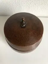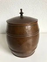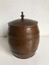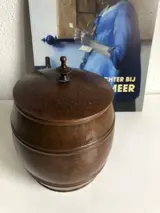 Een fraaie en originele gehamerd koperen Amsterdamse School tabakspot. In zeer goede staat. Afmetingen: hoogte 16 cm, diameter 12 cm. Wordt zorgvuldig verpakt en verzekerd verzonden.
