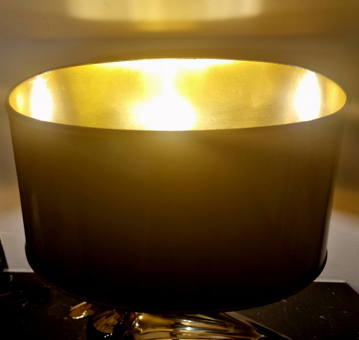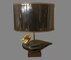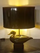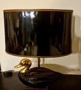 samengesteld uit een houten voet, een keramische eend en een offset lampenkap in glanzende zwarte lak aan de buitenkant en glanzend goud aan de binnenkant.