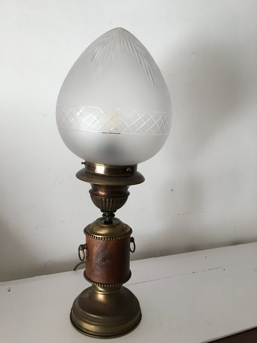 Jaren 50 tafellamp, groot (70x30 cm), houten schacht, bronzen voet en ornamenten, kristallen lampenkap, een integraal onderdeel van de beschrijving is afgebeeld in de hierboven gepubliceerde afbeeldingen. Professionele verzending.