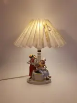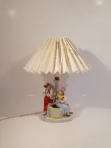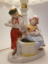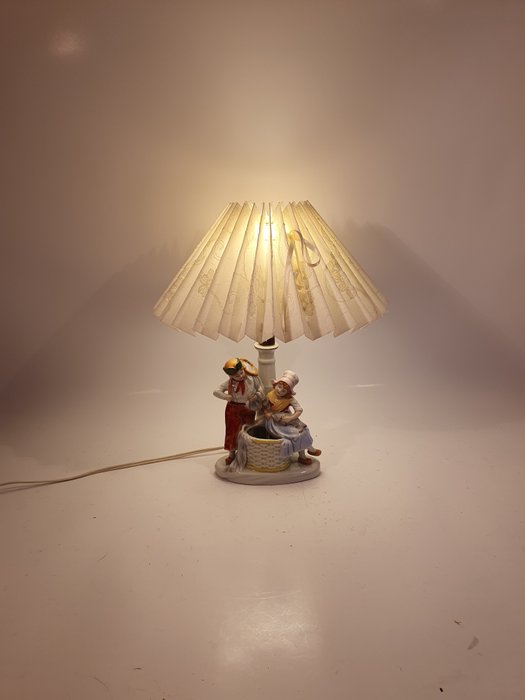 Vintage porseleinen lamp - met een afbeelding van een visser en een meisje, met een lampenkap gemaakt van stof op plastic. Gemarkeerd met "GERMANY" en modelnummer 5386.