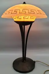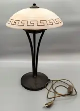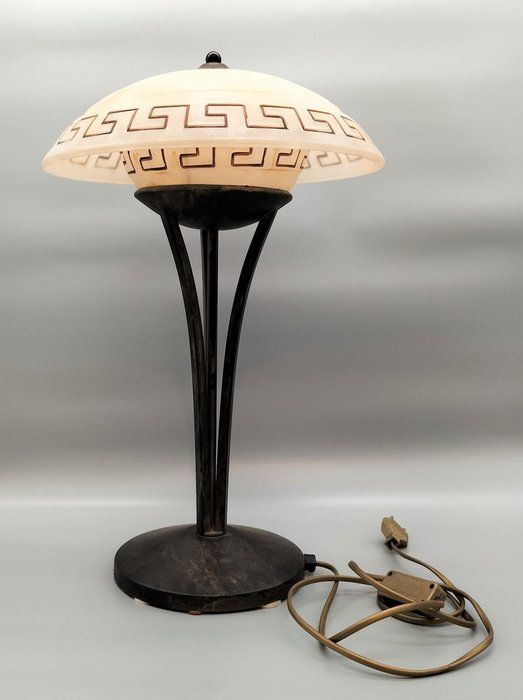 Tijdloze klassieke tafellamp, Griekse stijl. Deze fraaie lamp heeft 1 lichtpunt. Het traditionele armatuur heeft een mat roest uitstraling. Voorzien van mooi getint gemêleerd Greca glas voor sfeervolle verlichting. Zeer decoratief!