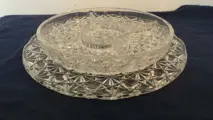 De schotel (doorsnee 32cm)kan onder de schaal (doorsnee 25cm) worden gepresenteerd maar ook separaat als serveerschaal. Samen wegen ze bijna 3 kilo.