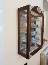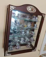 Vitrine te koop met set kopjes en schotels geschikt voor thuisopstelling.
