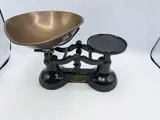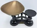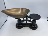 Fraaie engelse balans metmooi gepatineerde schaal,gebruikt voor het afwegen van meelproducten etc.