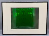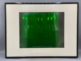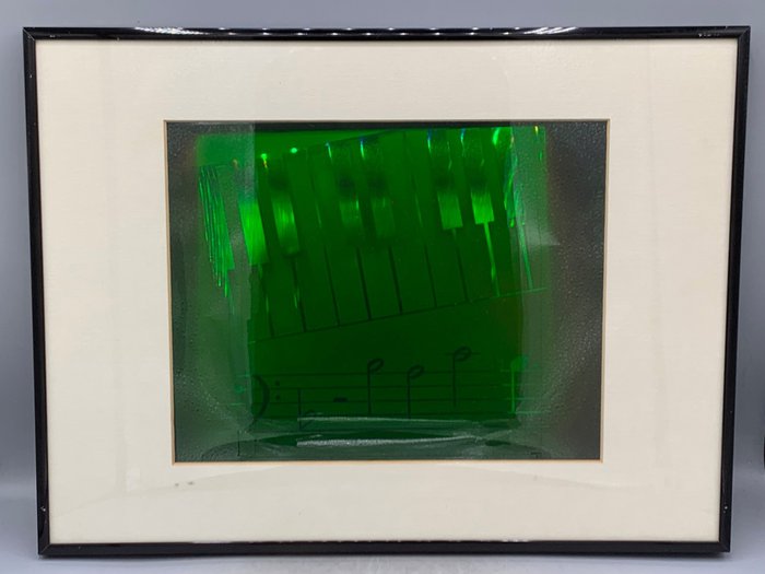 Een prachtig hologram uit de jaren 70 met een deel van een pianotoetsenbord en een paar maten muziek, lasergegraveerd met de Multiplex-techniek om verschillende holografische afbeeldingen van hetzelfde onderwerp te etsen die transformeren volgens de hoek van invallend licht. In feite zijn het de schaduwen van de zwarte noten die bewegen. Ingelijst in een kartonnen passe-partout achter glas in een aluminium lijst van 40,5 x 30,5 cm, zichtbare beeldmaat circa 25 x 20 cm.
