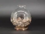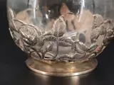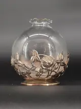 Fraai mondgeblazen vaasje met een verzilverde voet met fraai gestileerde bloembakken , het zou zilver kunnen zijn maar kan geen merkjes vinden.