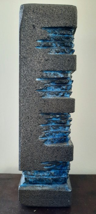 Zeer mooie vaas in gedeeltelijk geglazuurde blauwe zandsteen, brutalistische stijl. Het dateert uit de jaren 70.